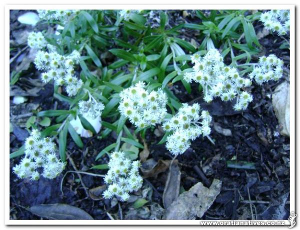 Vigorous dark green foliage with white straw-like flowers. Prefers cool spots, hanging over rocks and banks. Quite often in seepages.