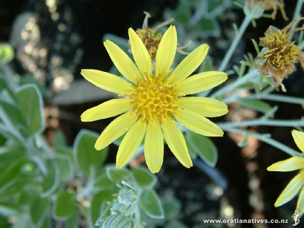 Grey foliage form from the Wairarapa coast. Yellow daisy-like flowers (summer). Best in well-drained soil and exposed to wind.