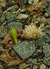 A fresh green pukatea seed capsule lies on the gravel with an older brown capsule which has split to reveal its fluffy seeds. |